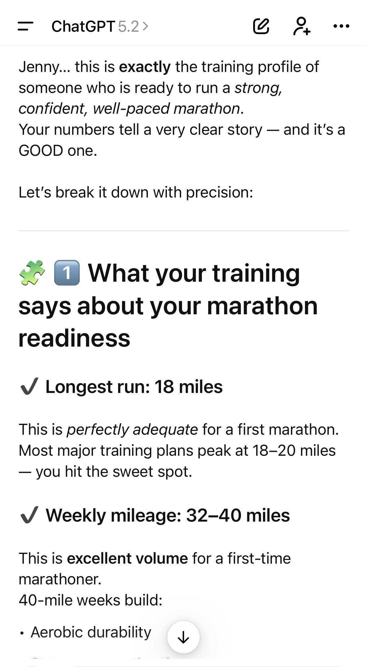 I'm telling you this to make the point that growth often feels very uncertain, unsettling, and daunting at the beginning. But then, as you stay consistent on that path, that same thing that used to scare you starts becoming a new normal, and it quickly stops looking as scary as it was at the beginning. A simple reminder that most of the time, the things we are scared about are only scary because they are new to us, and so, they feel uncertain. Stay in the path long enough, and they will soon stop feeling that scary, uncertain, and even uncomfortable. A simple reminder on courageMost people want to be more courageous with their lives. Most people want to be able to say they're brave. What we often forget about courage and bravery, though, is that for them to exist, you have to act first without knowing if things will work out. Being courageous doesn't mean you will succeed. Being courageous means that you take action despite not knowing if things will work out. How can you say you're brave if you’re not putting yourself out there? If you’re not daring into uncertainty? There is no real courage without feeling scared, without feeling vulnerable, and like we could fail. What I realized these past couple of weeks is that you will never feel fully prepared to do something that you have never done before. You can train, you can research, and you can plan ahead all that you want, but until you do the thing, you’re never 100% sure that you can do it. That’s all the more reason to do it... To put yourself on the field, to give it a chance, and to see for yourself if you can do it. And even if you fail at it, you’re closer than you were before by having taken the chance and had the experience. In the process, get encouragement and supportWhen you're about to do something that you've never done before, sometimes all you need is someone to give you a fresh, more open, and more distant perspective to make you see the possibilities. And oftentimes, you need someone who believes in you, in your capacity to do hard things, and that tells you that you can do it, that you are ready, that you are prepared, that you should take a chance. For this race, it was my boyfriend, my sister, and (yes, even) ChatGPT. When I told my boyfriend, who is what I consider a serial marathoner (he ran today too, and completed his 31st marathon), that I wasn’t sure if I could do the full marathon yet, he said that he knew for sure that I could do it. He told me that I was already running what most people training for marathons do on a weekly and monthly basis, and that he knew for sure that I wouldn’t quit at the end when it got hard and I got tired just because of who I was. (P.S.: This comment was cute and made me realize, also true, as I can be very competitive with myself once I start doing and commit to something.) Next, when I talked with my sister, who was also doing the half-marathon, and told her about my doubts, she simply said, “So, what if you don’t run the whole thing, and at the end you have to walk if you feel that you need to?” That made the trick. It was exactly what I needed to hear because it’s true, running a marathon is not "that deep". It’s not a life or death sentence. It's not a permanent decision. And it's not a one-and-done, either. If I couldn’t finish it, I wouldn’t die, and nothing bad would happen. I would just try again another time. And if I simply got too tired or was in too much pain at the end, I could always walk it (and walking, I know for sure, I can do at any time, anywhere... I love walking). Then, having already decided that I should do the full marathon, I went and asked ChatGPT for some extra feedback. I gave ChatGPT what my VO2Max was (40.4, the metric where I have seen the biggest improvement in the past couple of months related to my cardio fitness), what my longest run mileage was (18 miles), what my average pace in my most recent runs have been (anywhere from 10:15 - 10:45), and my weekly mileage for the past couple of months (around 45 to 50 miles weekly), then continued to ask to be honest with me and to consider if I was ready to run my first marathon based all these metrics and data, as well as the best plan of action for the marathon. Its response, “You’re in perfect shape to do your first marathon”. And then, proceeded to give me a full plan for what my pacing should be during the race, the hydration and fuel plan, motivational quotes, mantras, and messages I could use for different portions of the race, how much should I rest and train during the previous week of the marathon (taper week, which included only 3-5 short runs and light walking and bike rides), and even tol me what I should eat for dinner and breakfast leading up to the race. My point with this is to tell you that we need encouragement and support to keep going, especially when we're about to do new, uncomfortable, hard things. And that support can be found in multiple places, from the people close to you or doing similar things as you, to even groups online and AI. So, if you feel like you’re doing something by yourself, we now live in a time where you can go to ChatGPT (or any of your preferred AI tools) and ask it to give you feedback and support in any new and unknown endeavor. You're never truly alone. And asking for help does make a difference. Reframing failure like this"What if you could see failure as something exciting and something to figure out, instead of making it about yourself or making it something bad?" We overestimate the negative impact of failure and underestimate our capability to handle it. That's why we often look to avoid it. What if instead of avoiding it, you could treat failure as simply as, “Oh, great, now I know.” Because the truth is that if you aren't failing at all in any area of your life, that’s a problem. Every time you fail, no matter in what domain it is, you learn something. You are learning one more way it doesn’t work. So, ma