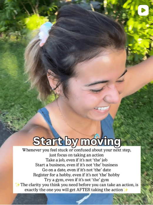 Whatever you choose to put in first determines the kind of life you have. Choose intentionally. Your search for "more clarity."We all want clarity in our lives. We all want to feel like we know exactly what we're doing with our lives, where we're going next, and how we're getting there. That's why, oftentimes, when we feel unsure about our next steps, we feel that we 'should' have already figured it out. That we are "late" or "behind" for not having the 'perfect plan' or the 'perfect vision' from where we are now to where we want to go next. We feel that we need to have the perfect plan for the perfect career, the perfect business, the perfect relationship, the perfect way of doing things. We think we need to feel clear about the 'what' and the 'how' before we can do anything. And so, we don't take any action, waiting for clarity or for the right plan to arrive. Unfortunately, it doesn't work like this. It's usually the opposite way. Taking action (no matter how imperfect or 'wrong' it may feel) is actually what creates the clarity you're looking for. And often, it doesn't happen quickly or how we initially pictured it either... You may take action and feel like nothing is happening. No feedback, no grand breakthroughs, no clear direction. It’s honestly frustrating and disappointing. That's why most people quit when they think nothing is happening. We all assume that if we don't get the perfect results or if we don't immediately get clarity, then it means we’re on the wrong path. What would happen if you started considering this part as exactly what you need to move forward? That if you keep going, if you keep showing up, trying, experimenting, exploring, failing, and refining, you start to get the clarity you're looking for, and you start to see what matters most to you. Because these "a-ha moments" don't suddenly just happen to us; they're built upon days, weeks, months, and sometimes even years of experimenting, failing, and readjusting. So, try this: The next time you feel stuck or confused about the step ahead, just focus on taking an action.